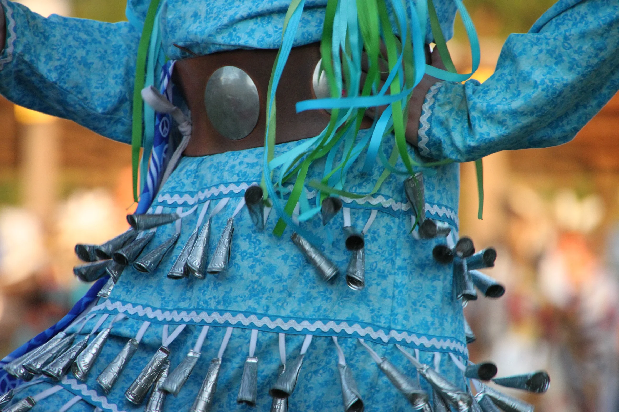 The Jingle Dress, also known as a Prayer Dress, is considered to bring healing to those who are sick. As mentioned above, the dance gets its name from the rows of (metal cones) sowed to the dresses. These cones are traditionally made from rolled snuff can lids and hung from the dress with ribbon close to one another, so they make a melodic sound as the girls and women dance.
